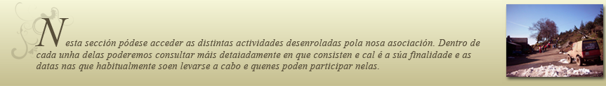 ![]() Las fechas de las actividades podrán sufrir variación por motivos ajenos a la Asociación y se realizaran siempre y cuando haya un grupo mínimo de participantes. Para contactos llamar a los teléfonos 986 87 12 80 // 986 - 85 17 21 Pulsa na ligazón que está xusto debaixo para baIxar o Calendario de Actividades do 2015