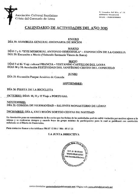 ![]() Las fechas de las actividades podrán sufrir variación por motivos ajenos a la Asociación y se realizaran siempre y cuando haya un grupo mínimo de participantes. Para contactos llamar a los teléfonos 986 87 12 80 // 986 - 85 17 21 Pulsa en el link que encontrarás debajo para descargar el Calendario de Actividades del 2015